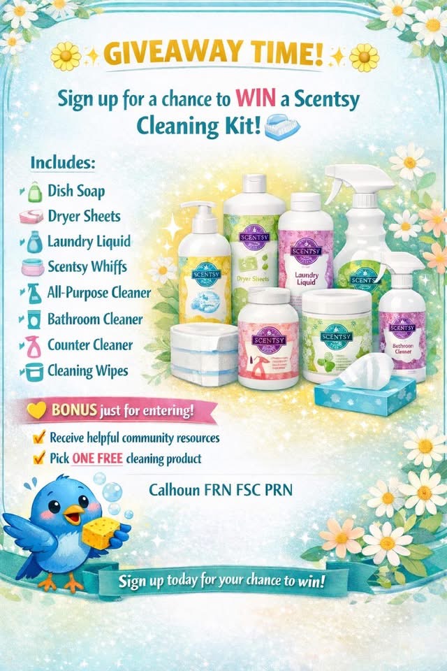 stop by and fill out a form for a chance to win a basket of Scentsy cleaning supplies!! You get a random cleaning item just for signing up!! We are open 8 AM – 4 PM.